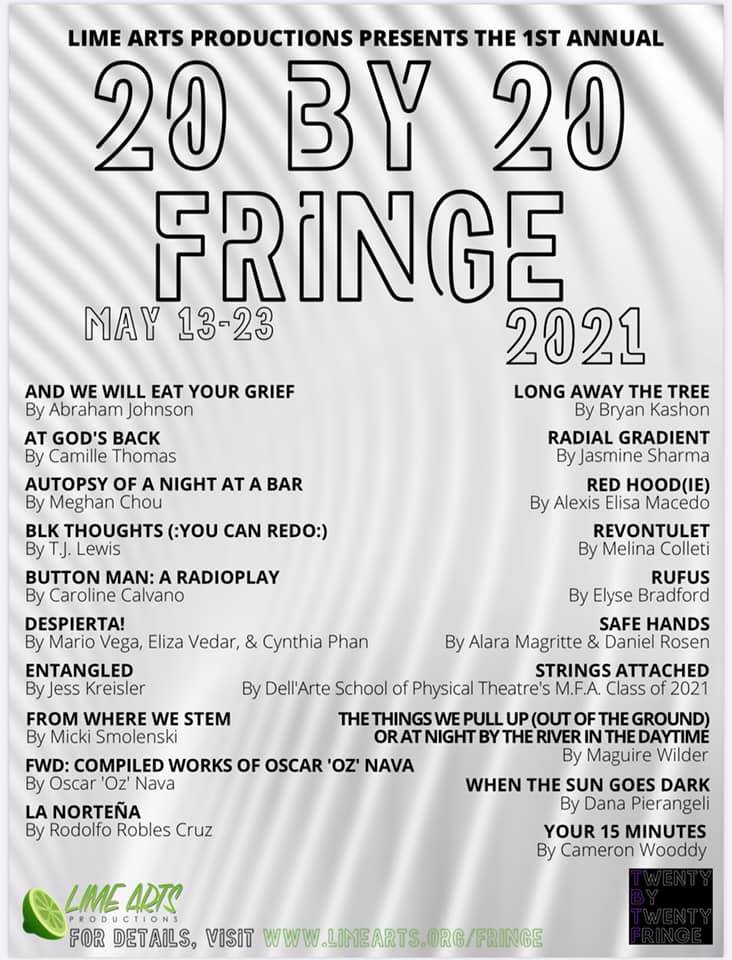 From the Lime Arts website, “Twenty-By-Twenty Fringe (TBTF) is a new pilot program that was conceived in an effort to provide a platform for artistic directors, theatre practitioners, and theatre-goers across the country to watch bold, innovative, and intimate new works created by the most refreshing and current voices, 20 year olds*.”