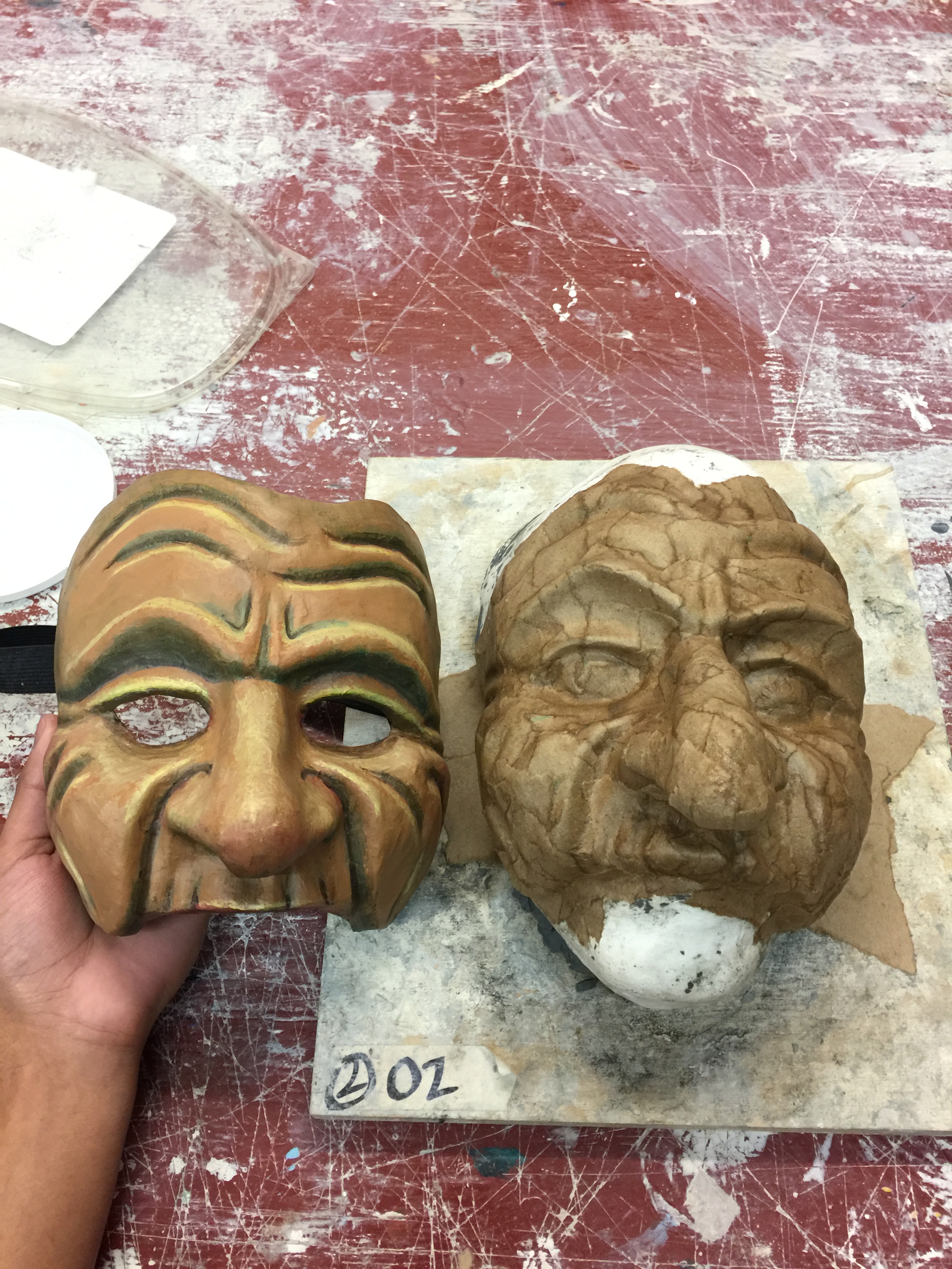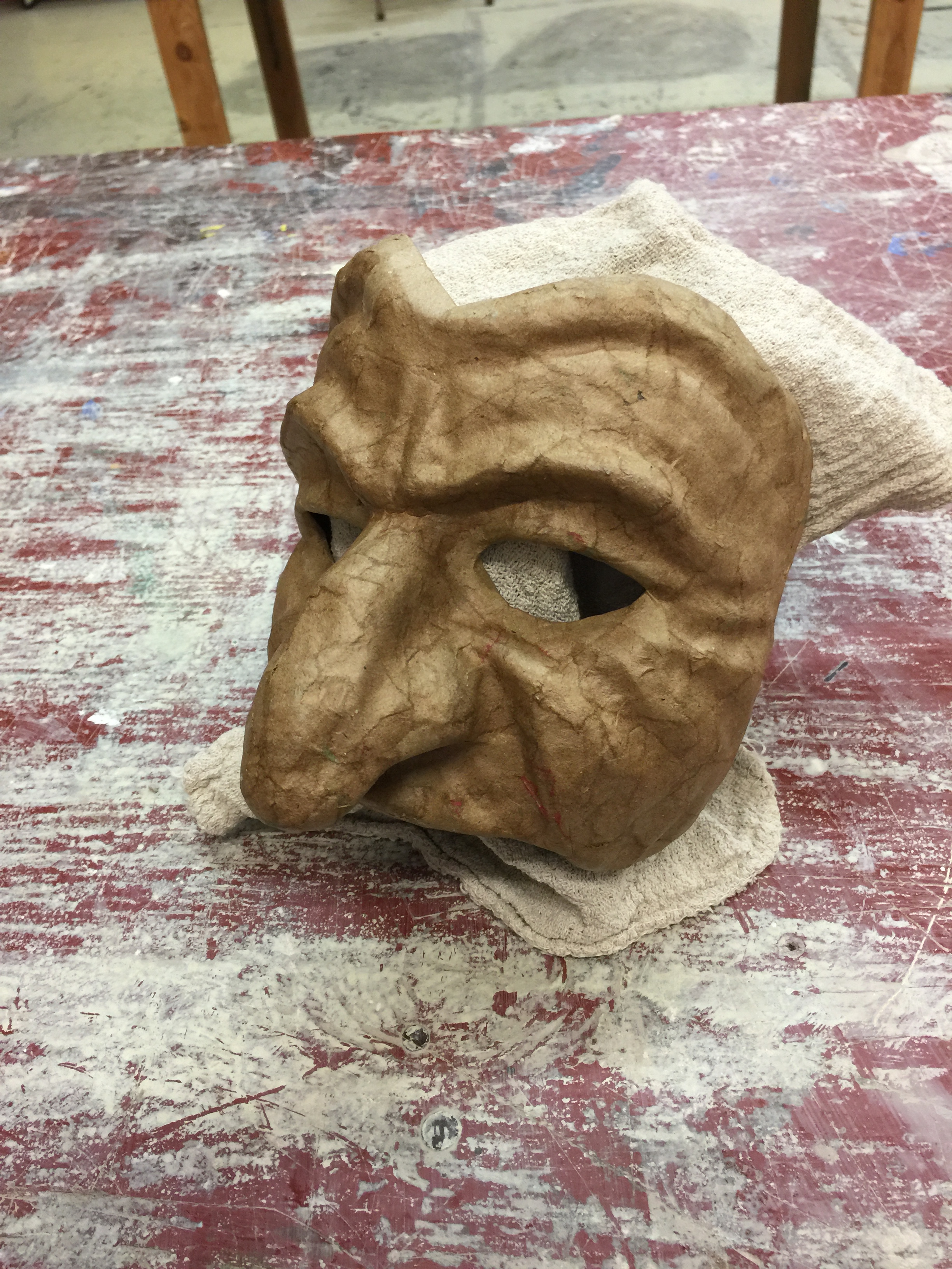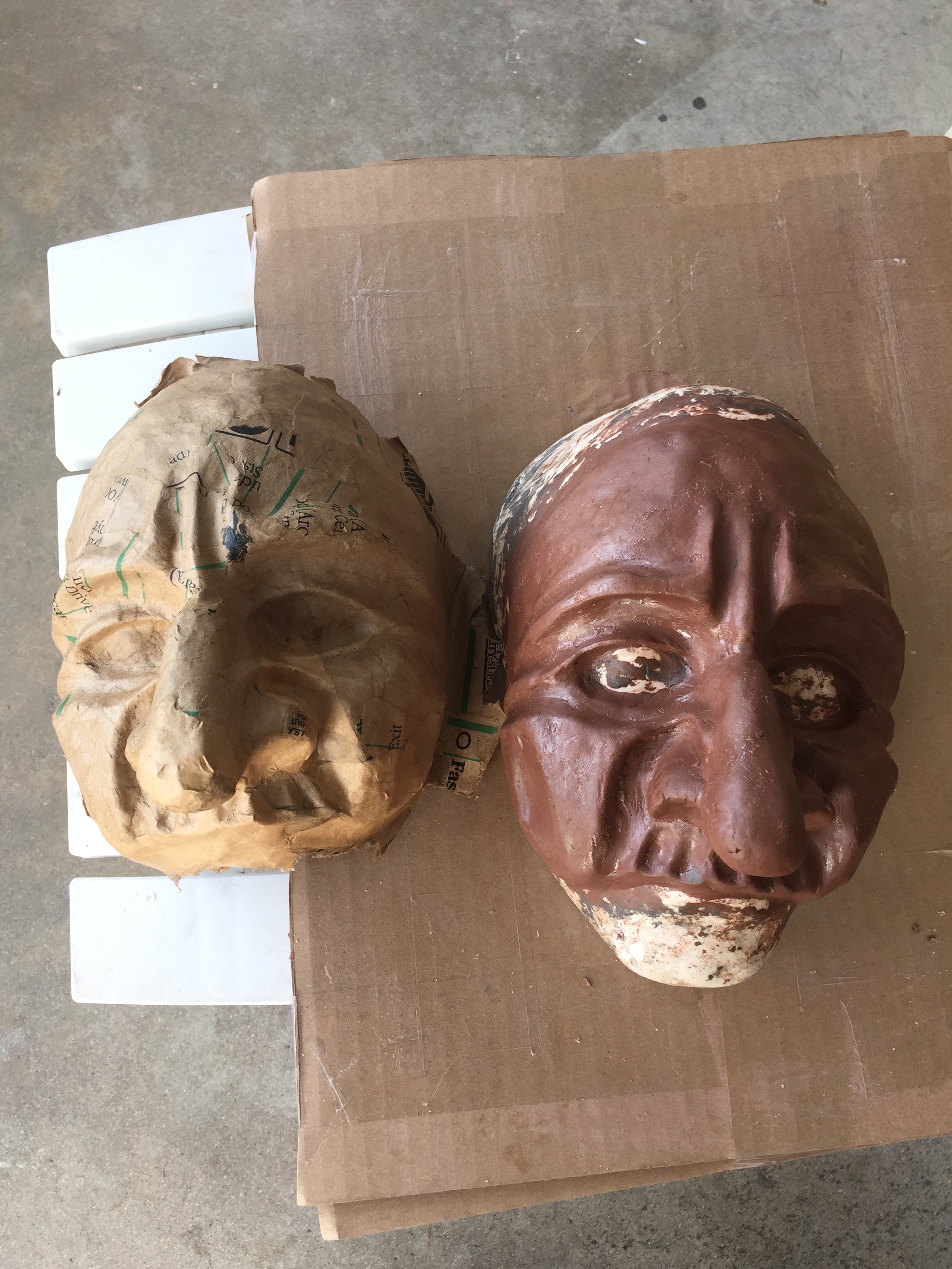 These character masks are paper mache finished with acrylic paint. Based on traditional Italian Commedia del’Arte stock characters.